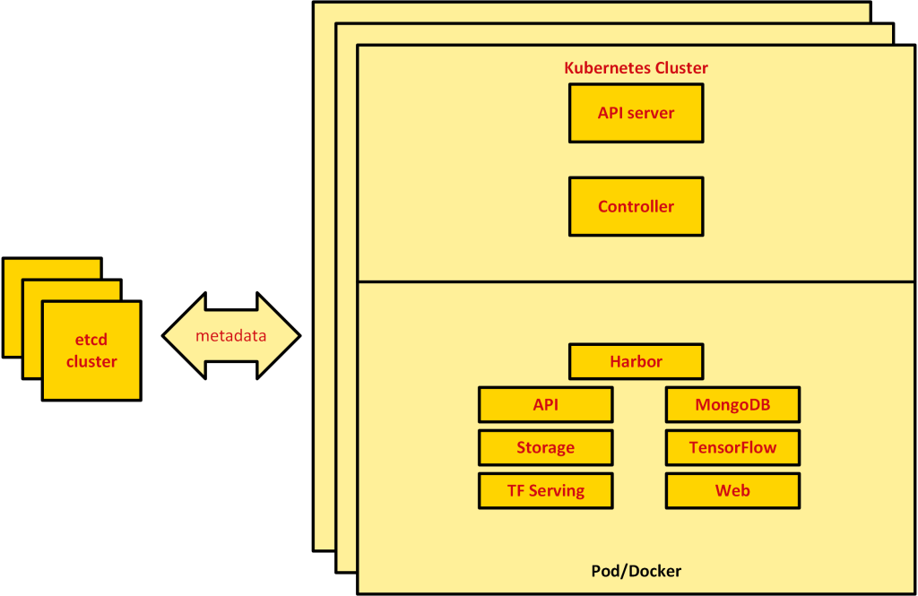 In order to ensure the high availability of the Kubernetes cluster, the etcd cluster is adopted. etcd is a high-performance storage system based on key-value pairs. Since Kubernetes will store all metadata information in etcd, if the single-node etcd It cannot meet the main and backup requirements. The use of etcd clusters can effectively prevent the impact of etcd downtime. API-Server is the core component of calling Kubernetes API, which is very important to API, because it will call API-Server in Kubernetes to create services such as TensorFlow, TensorBoard, Tensor. The distributed container registry is also deployed on the Kubernetes platform, and Kubernetes is the control center of the entire platform.